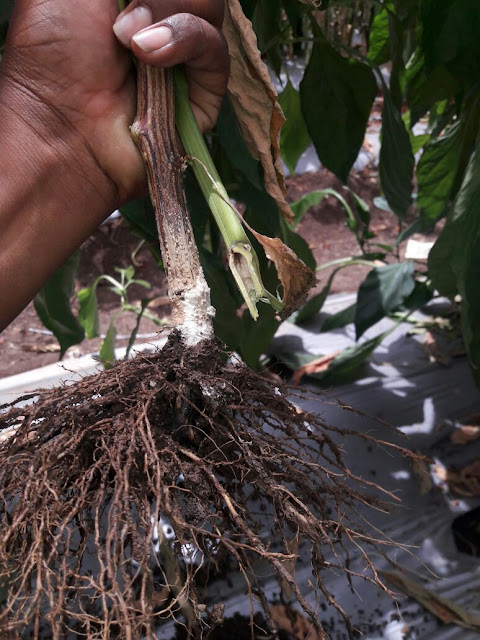 रोपाचा जमिनीलगतचा खोडाचा भाग आणि त्यामुळे रोप कोलमडते.
